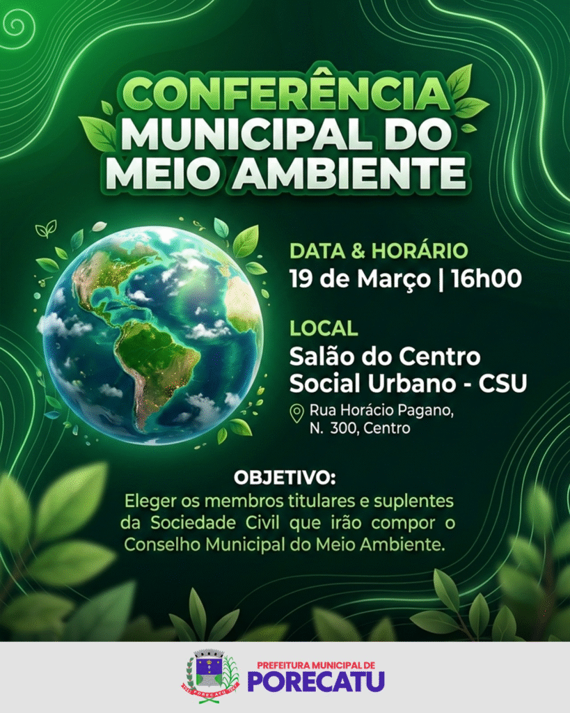 Geral do Plano Diretor), convida toda a população para participar da Conferência Municipal do Meio Ambiente de Porecatu. Este é um momento importante para que a população se reúna, dialogue e contribua com ideias para a construção de um futuro mais sustentável para o nosso município.