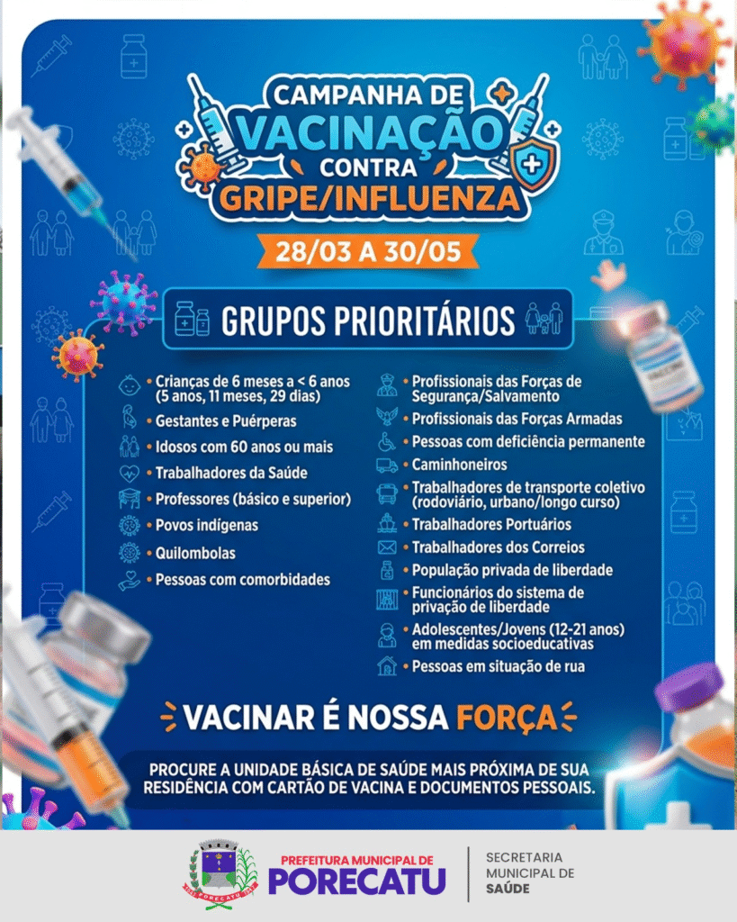 Secretaria Municipal de Saúde Campanha de Vacinação Contra Gripe/Influenza 📅28/03/2026 até 30/03/2026 📍Todas as Unidades Básicas de Saúde Faltam: 0dias 0horas 0minutos 0segundos 📤 Compartilhar e exportar 📆 Google Agenda 📥 Baixar .ICS 🖨 Imprimir 🔗 Copiar link ← 1° Campeonato de Futebol Suiço 50+ – Semifinal e FinalDIA D de Vacinação Contra Gripe/Influenza →