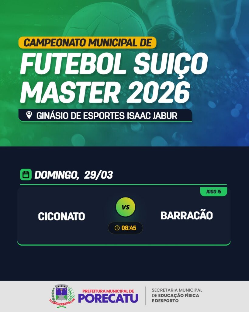 Secretaria Municipal de Educação Física e Desporto Campeonato Municipal de Futebol Suiço Master 2026 📅29/03/2026 🕐08:45 às 09:45 📍Campo do Ginásio de Esportes Isaac Jabur Faltam: 0dias 0horas 0minutos 0segundos 📤 Compartilhar e exportar 📆 Google Agenda 📥 Baixar .ICS 🖨 Imprimir 🔗 Copiar link ← DIA D de Vacinação Contra Gripe/Influenza