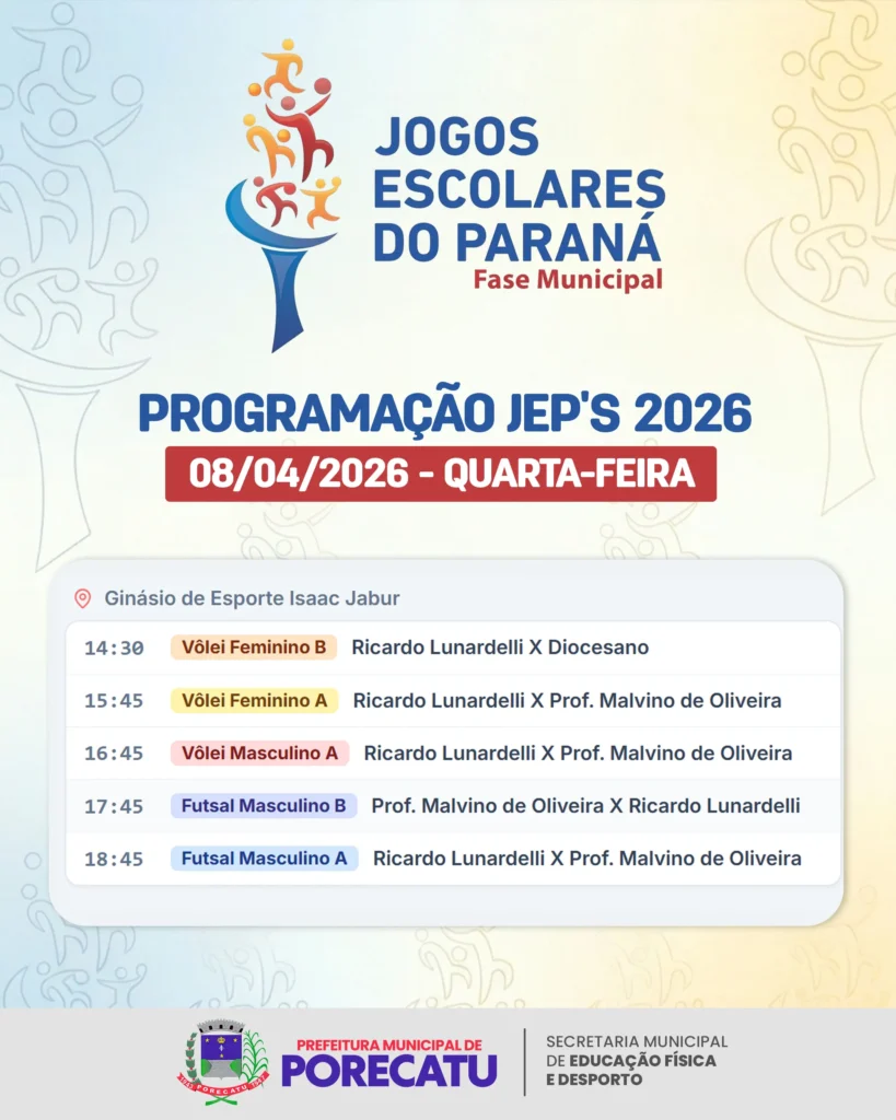Secretaria Municipal de Educação Física e Desporto JEP´s 2026 – 08/04/2026 📅08/04/2026 📍Ginásio de Esportes Isaac Jabur Faltam: 0dias 0horas 0minutos 0segundos 📤 Compartilhar e exportar 📆 Google Agenda 📥 Baixar .ICS 🖨 Imprimir 🔗 Copiar link ← JEP´s 2026 – 07/04/2026JEP´s 2026 – 09/04/2026 →