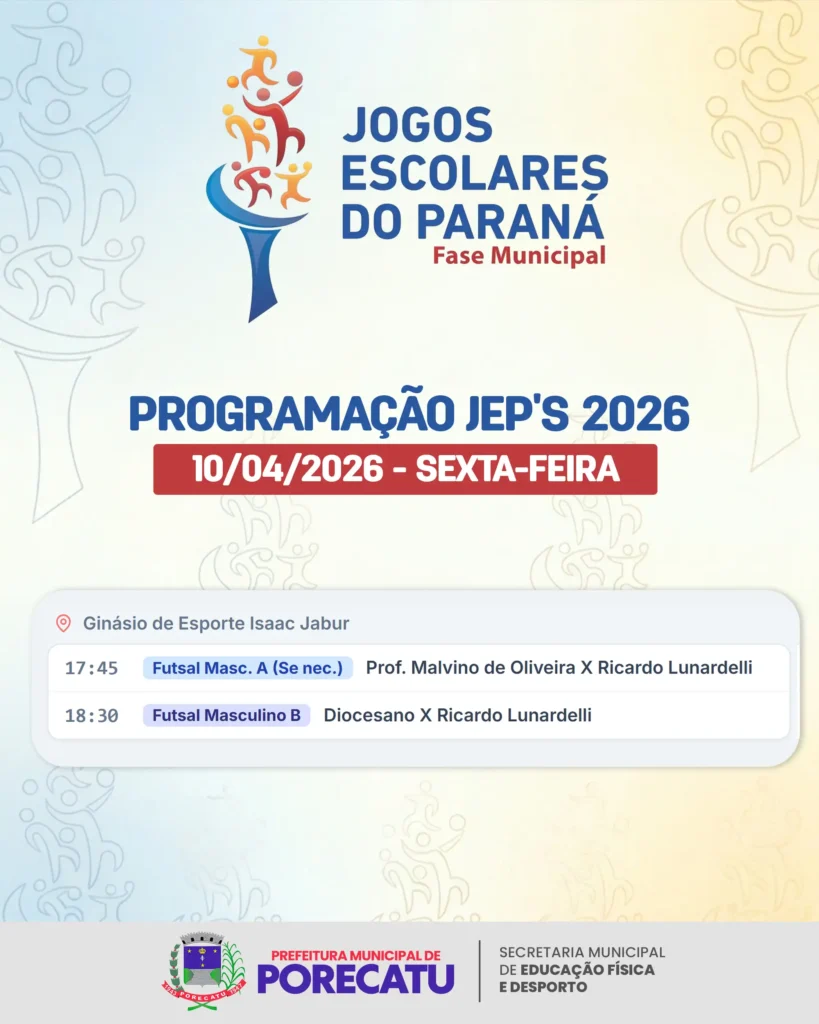 Secretaria Municipal de Educação Física e Desporto JEP´s 2026 – 10/04/2026 📅10/04/2026 📍Ginásio de Esportes Isaac Jabur Faltam: 0dias 0horas 0minutos 0segundos 📤 Compartilhar e exportar 📆 Google Agenda 📥 Baixar .ICS 🖨 Imprimir 🔗 Copiar link ← JEP´s 2026 – 09/04/2026