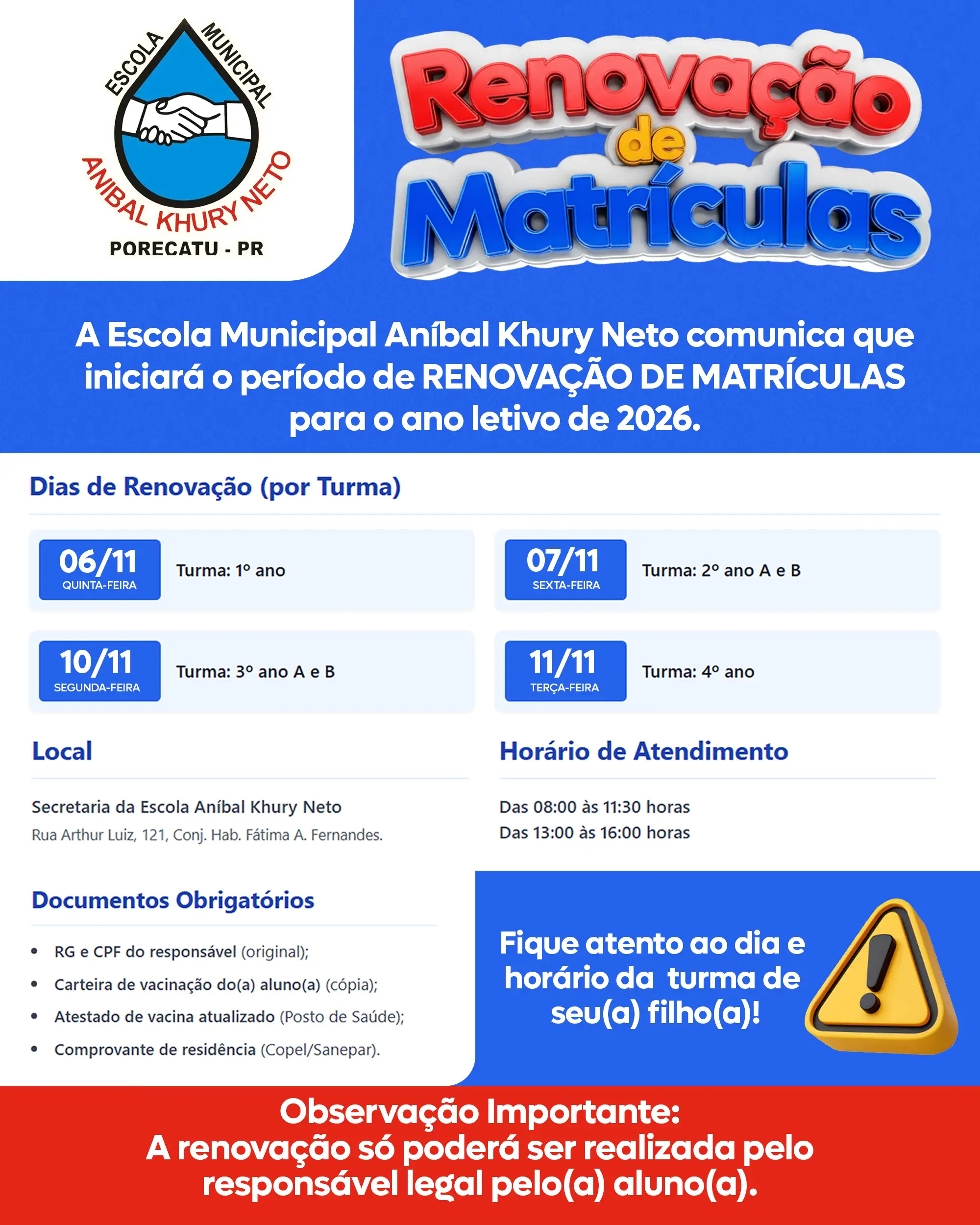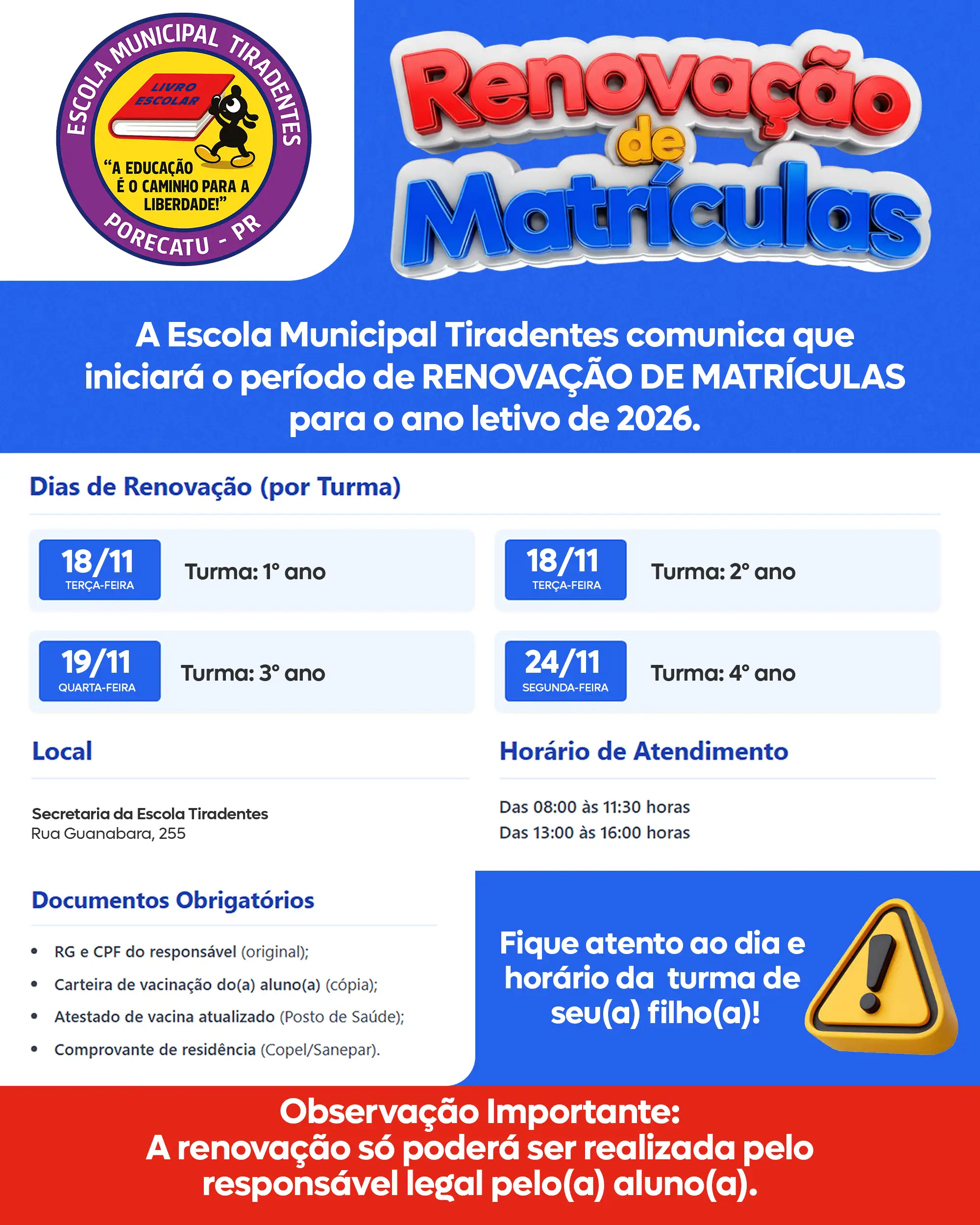 As escolas municipais e CMEIs de Porecatu anunciam o início do período de Renovação de Matrículas para o próximo ano letivo! 🎒✨