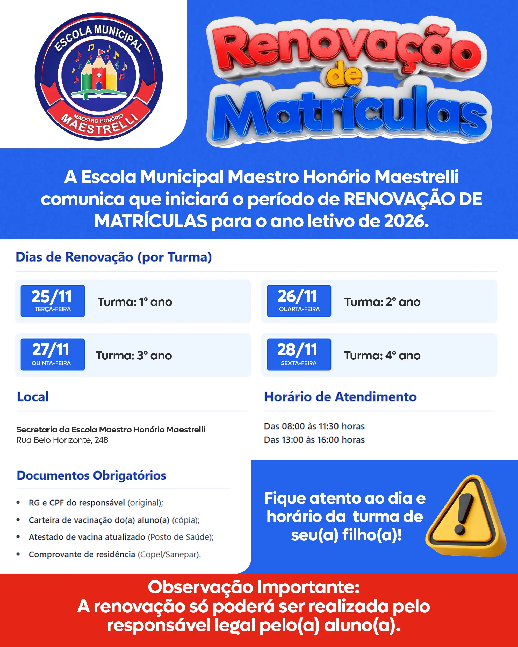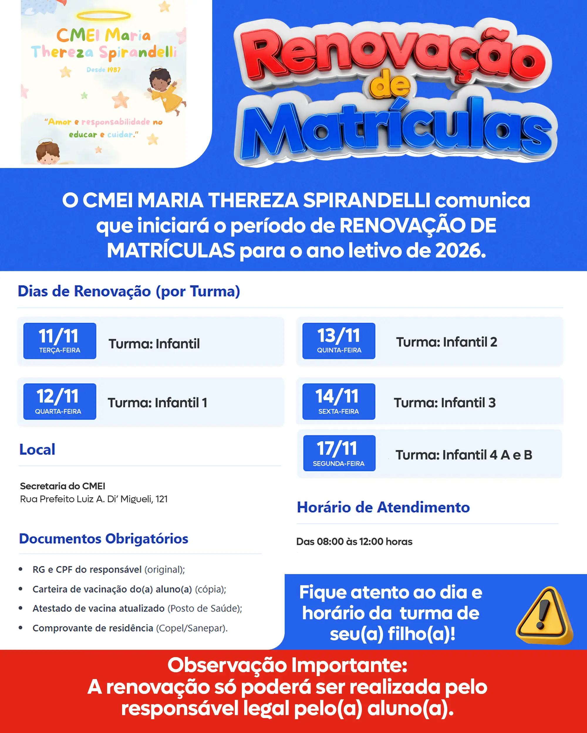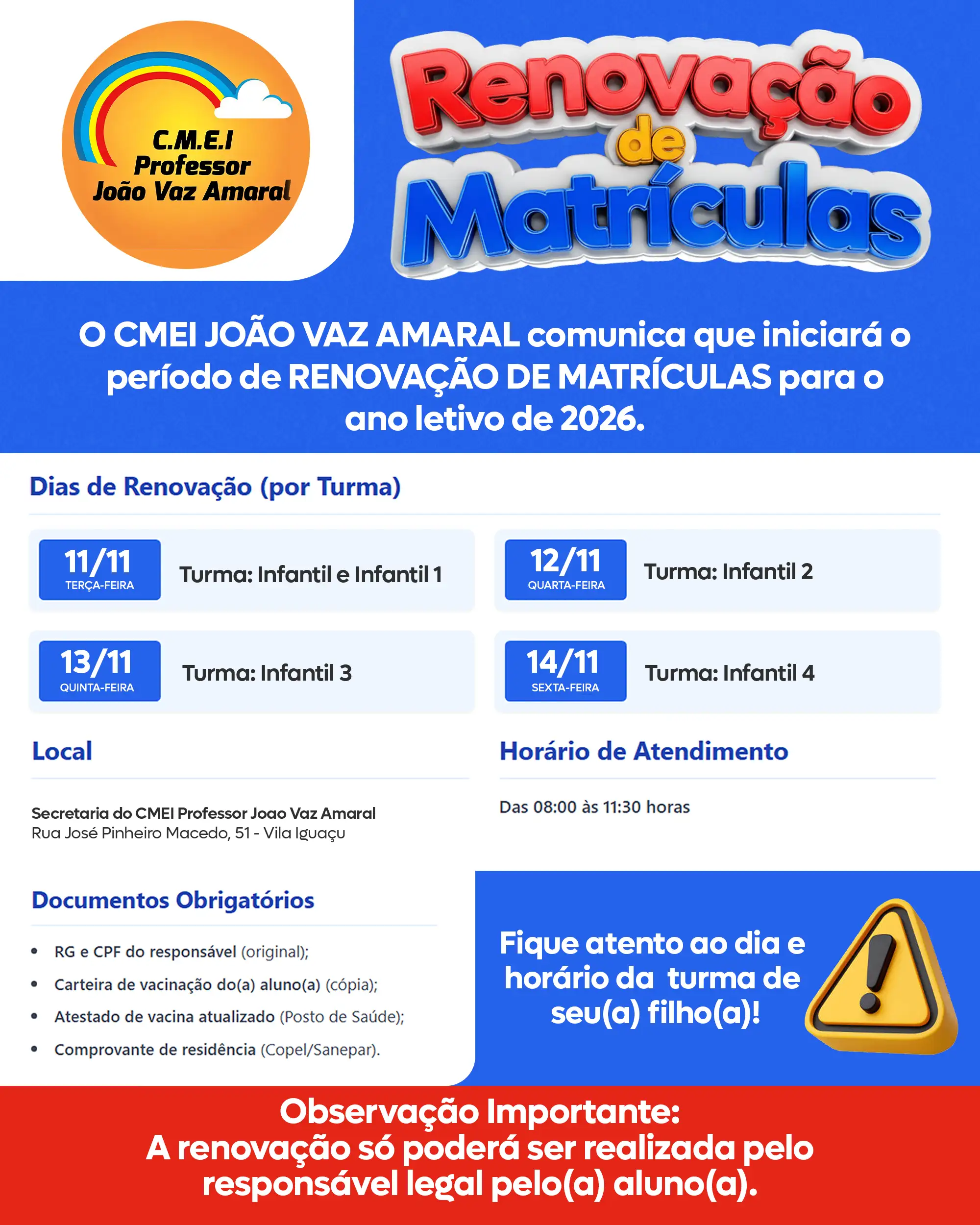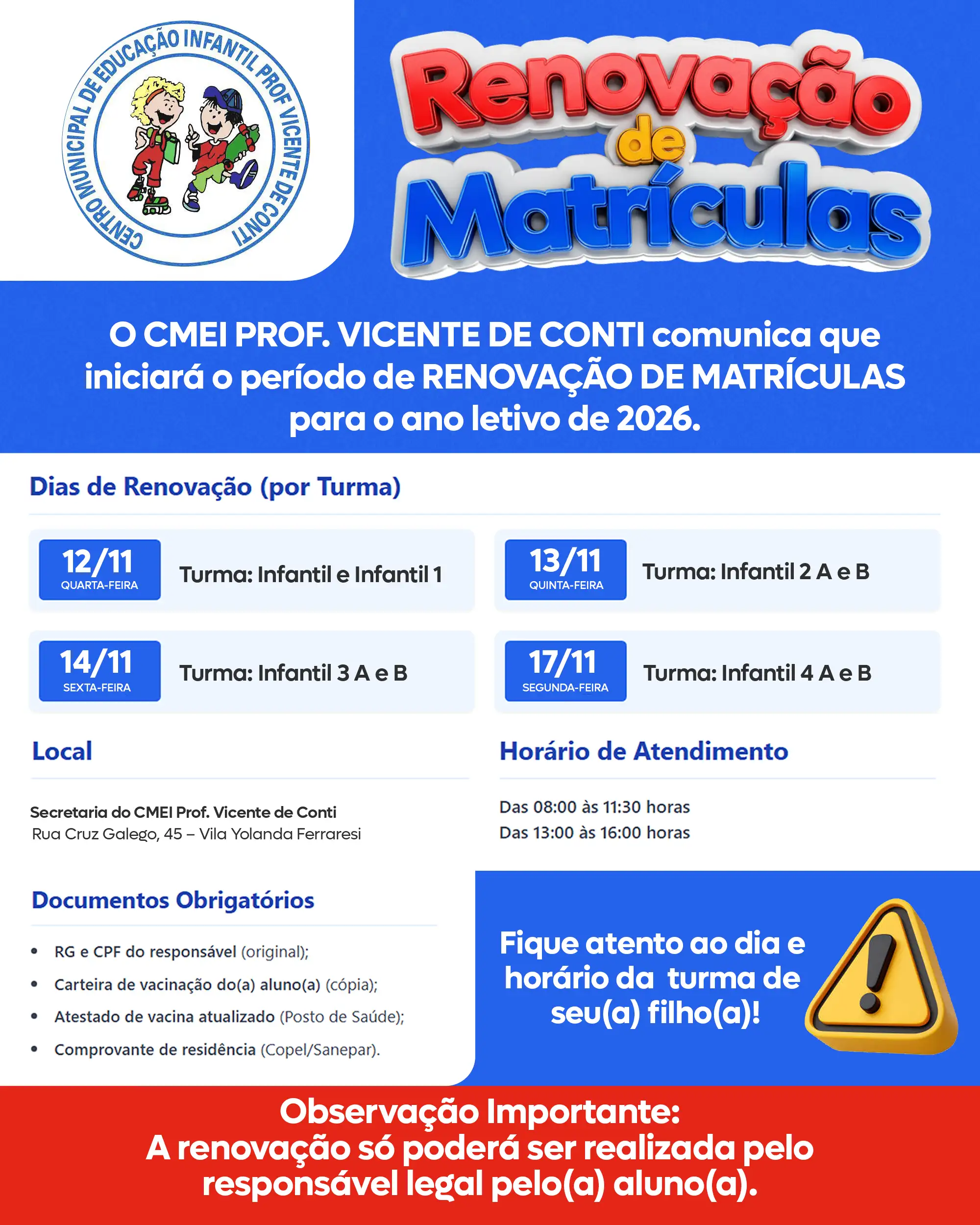 Fique atento ao dia e horário da turma de seu filho! ⏰📅