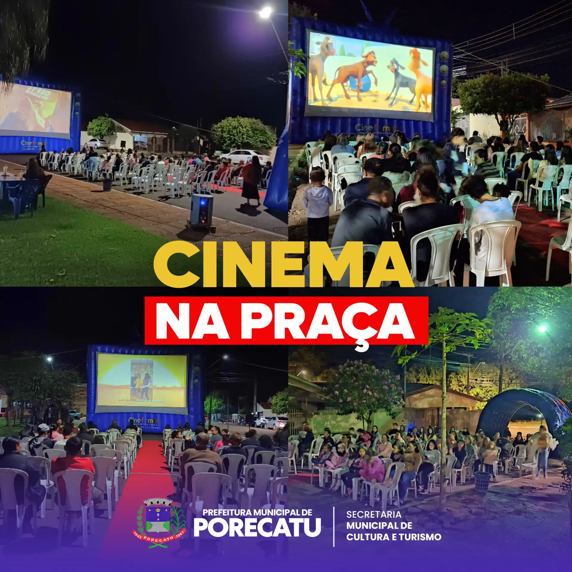Nos dias 21 e 22 de junho, a Prefeitura Municipal de Porecatu, por meio da Secretaria Municipal de Cultura e Turismo, realizou mais uma edição do Cinema na Praça, levando diversão, cultura e momentos de lazer para as famílias porecatuenses.