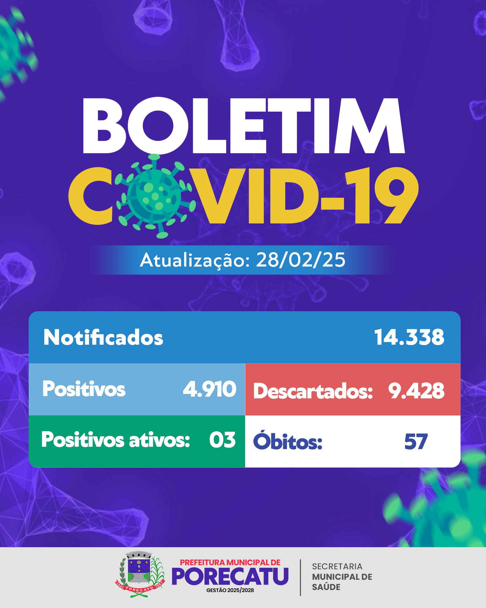 Início » Secretaria Municipal de Saúde » BOLETIM COVID-19 – ATUALIZAÇÃO 28/02/2025