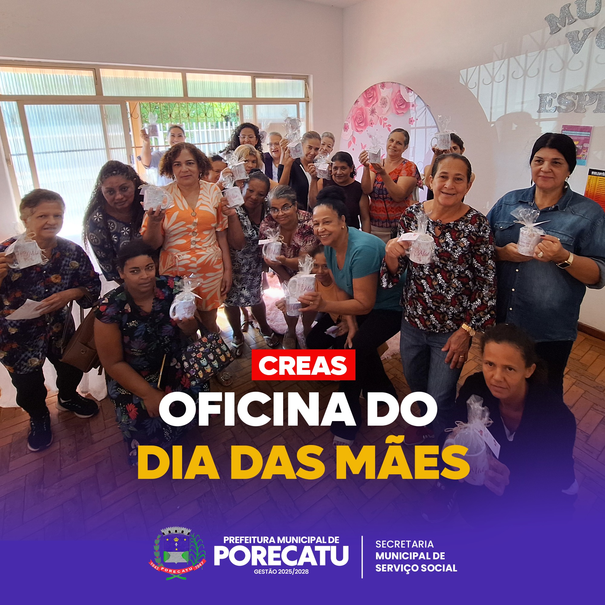 No dia 08 de maio de 2025, o CREAS de Porecatu promoveu a oficina “Flores que Renascem” em homenagem ao Dia das Mães, com o objetivo de fortalecer o emocional e a autoestima das participantes. Durante a atividade, as mães escreveram palavras de força e superação em flores de papel. Em seguida, realizaram uma caminhada até a Secretaria de Serviço Social, onde criaram um jardim coletivo. O evento foi encerrado com um café da manhã especial no CREAS, onde as participantes receberam uma lembrança comemorativa.